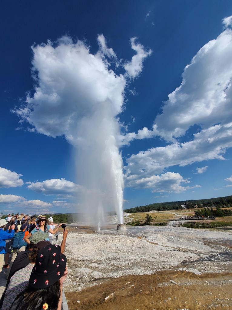 We didn’t time our hike to see any eruptions, but got really lucky that we saw one of the big ones. This turned into a double digit hike day (just shy of 15 miles), and my feet needed a break! So, I decided to rest at the benches in front of Beehive Geyser. Beehive erupts erratically, so our timing couldn’t have been better. After waiting about 15 minutes, we were treated to a show as Beehive erupts to heights of 150-200 feet. I dare say, it was even more spectacular to watch than Old Faithful.