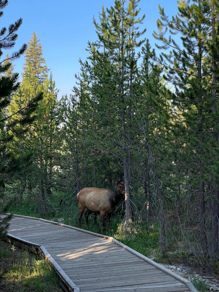 The ADA accessible one-mile trail does a figure 8 in two loops, right along the banks of Yellowstone Lake. There were a swarm of bugs (possibly mosquitos) along the shoreline, but it was still an very enjoyable trail. On our way back to the car, we encountered an elk blocking our way. Luckily there was another access point to the parking lot as this particular elk was pretty aggressive. As always, give wildlife all the space they need. If they’re blocking the trail, go back and wait it out, or find another way to get to your destination.